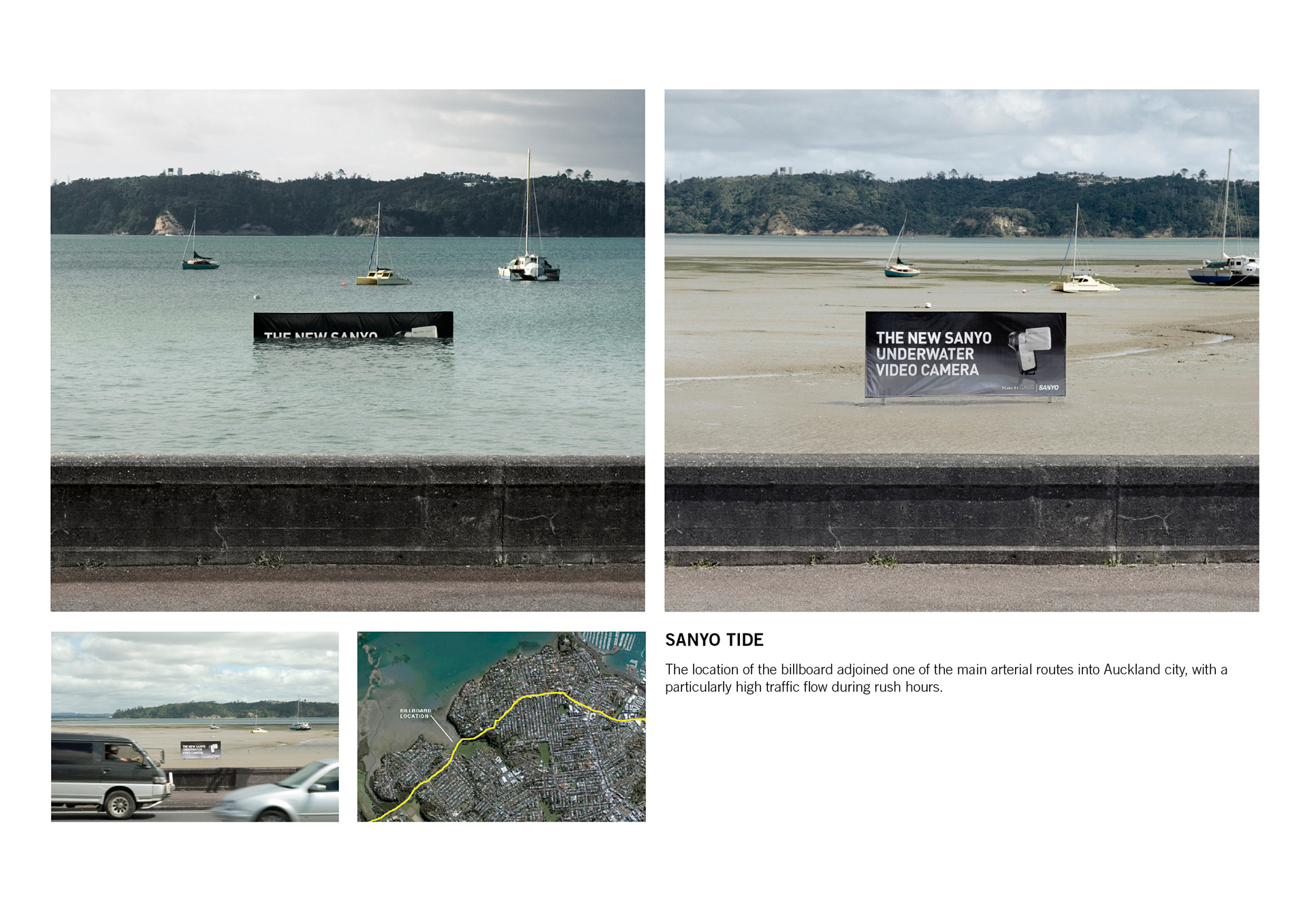 A billboard that showed the product's underwater capability by revealing itself using the tide.