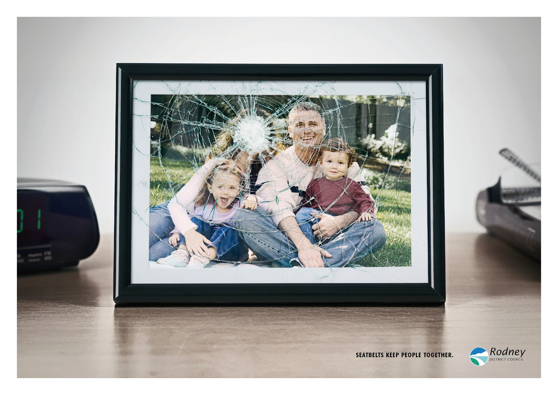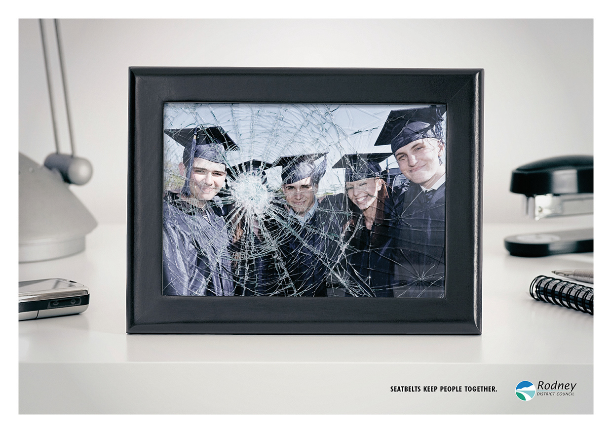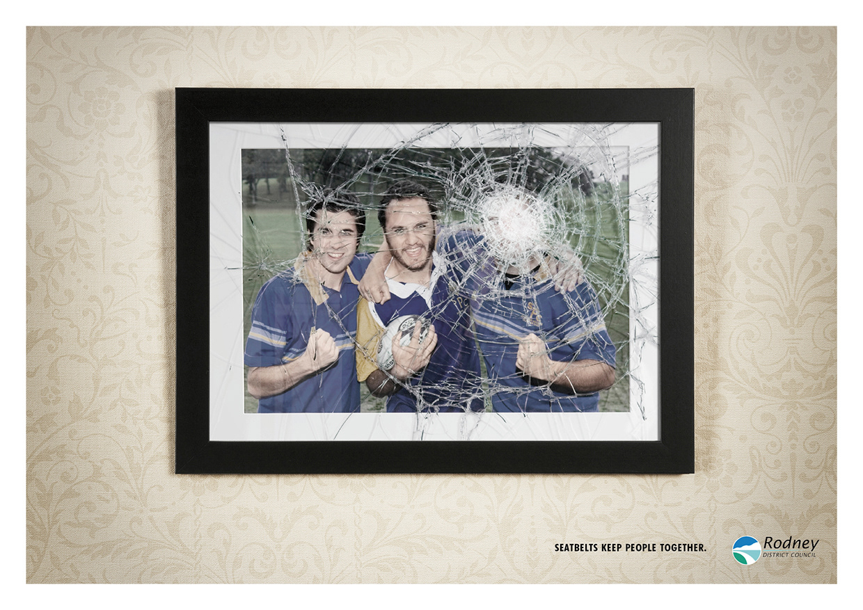 Print campaign for Rodney District Council 'Seat belts keep people together'